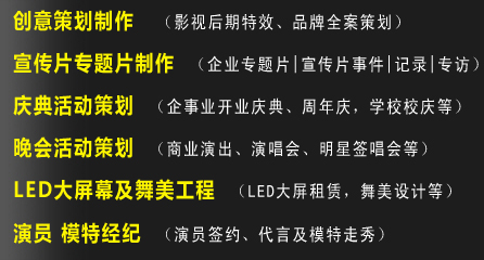 智慧力——?jiǎng)?chuàng)作團(tuán)隊(duì)   創(chuàng)意總監(jiān)——?jiǎng)?chuàng)意來自生活,高于生活    美術(shù)指導(dǎo)——身手敏捷,思想敏銳,具有獨(dú)特的美術(shù)嗅覺   資深策劃——思維縝密而又膽識過人,常常給人意外之喜   經(jīng)典影視.品牌傳播,采用國際化的Team作業(yè)模式——